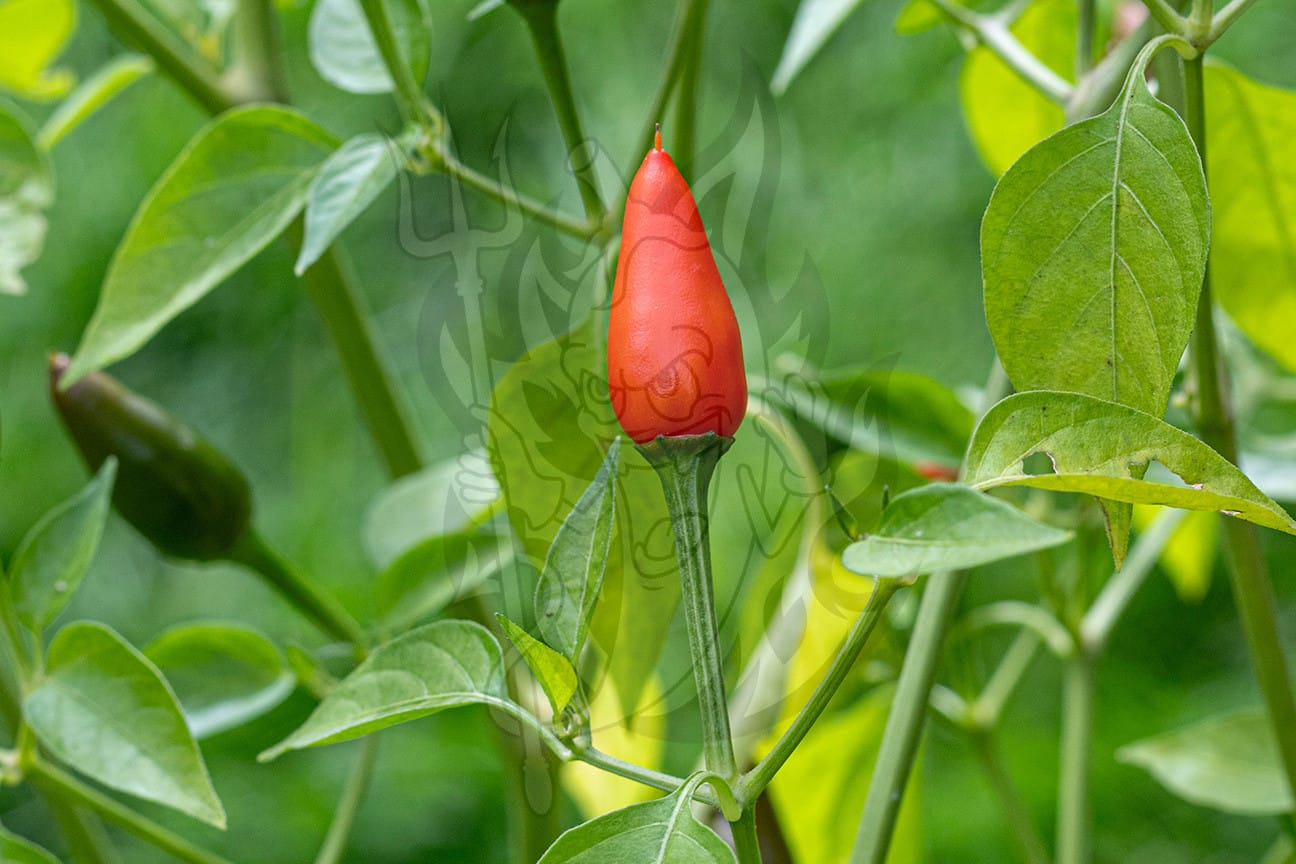 Растение среднерослое, высота 60 – 90 см, полураскидистое. Плоды конусовидной формы с заострённой вершиной, прямостоячие, гладкие, блестящие. В стадии технической спелости зелёного цвета, по мере созревания цвет меняется на коричневый. Созревшие плоды окрашены в красный цвет. Длина плода 2,3 – 2,6 см, диаметр 1,1 – 1,3 см. Вес 1,45 – 1,9 г. Толщина стенки плода 1 мм. Количество семенных камер 2.